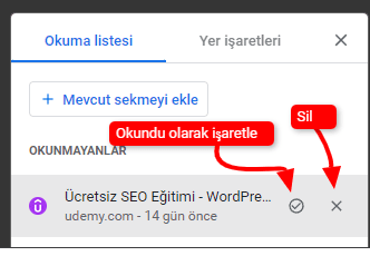 - Açılan yan panelde “Okuma Listesi” sekmesini seçin.
